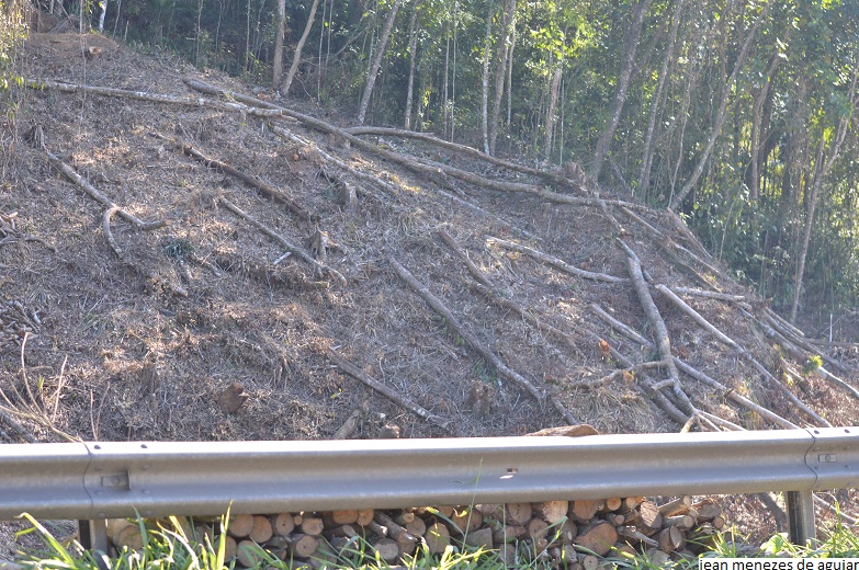 Desmatamento em área íngreme junto à pista, podendo contribuir para deslizamentos e interdições da estrada.