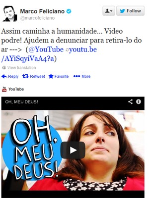 Feliciano tem o direito de se manifestar com sua frase: “Assim caminha a humanidade… Vídeo podre! Ajudem a denunciar para retirá-lo do ar”. E a sociedade tem o direito de responder: “Assim caminha a humanidade… Deputado podre! Ajudem a denunciar para retirá-lo do ar”. OG.