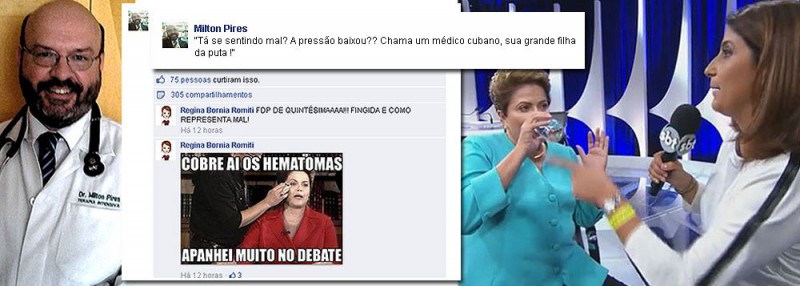 Agora, um novo episódio de ódio explícito, envolvendo inclusive violação profissional à medicina. O médico gaúcho Milton Pires escreveu no Facebook sobre a queda de pressão de Dilma Rousseff no último debate: “Tá se sentindo mal? A pressão baixou??? Chama um médico cubano, sua grande filha da puta!”