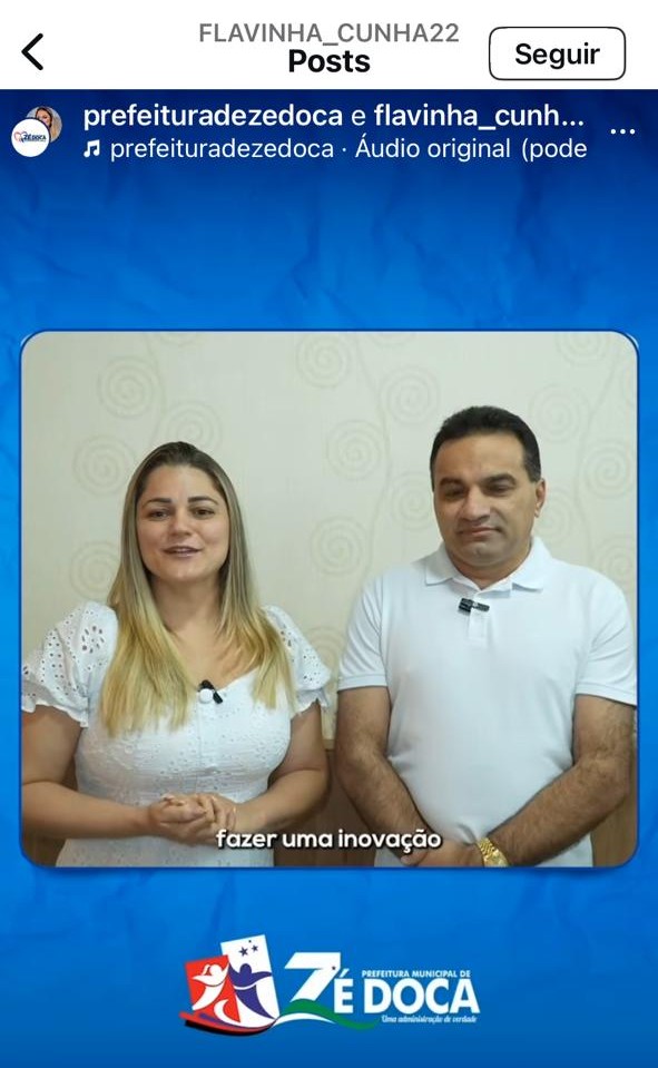Em vídeo de 20/1/2025, imagem acima, no Instagram da prefeita (@flavinha_cunha22), reproduzido no G1, abaixo, em 5/2/2025, ao lado do deputado Josimar Cunha, vulgo “Maranhãozinho”, a Prefeita Flaviana Vilar Rodrigues (PL) contou a novidade, com o deputado. No vídeo o deputado afirma: “O engraçado prefeita é que neste ano nós não teremos o Carnaval tradicional em Zé Doca”, a que a prefeita, a seu lado, confirmando, acrescenta: “se preparem para o nosso primeiro adora Zé Doca”.